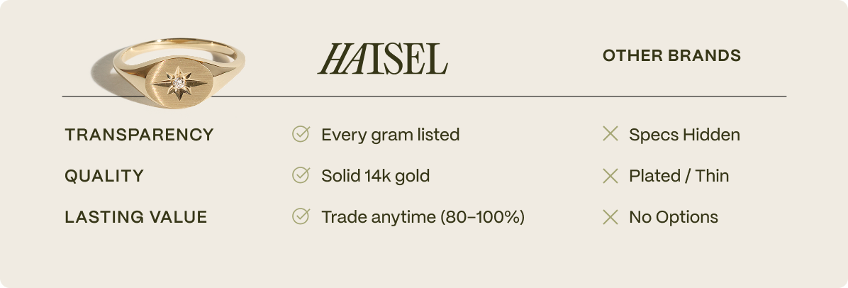Change your mind anytime. Trade in any piece you’re ready to part with for 80–100% Haisel credit, based on condition and timing.